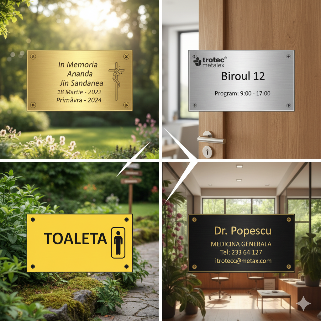 Prima impresie contează enorm, mai ales în mediul de afaceri. O plăcuță gravată pentru ușă sau birou, realizată din materiale precum metalex Trotec, plexiglas sau lemn, transmite un mesaj de profesionalism, ordine și atenție la detalii. Acestea nu doar că ajută la o orientare ușoară pentru clienți și parteneri, dar contribuie și la branding-ul companiei. Gravura fină, rezistentă în timp, asigură că numele firmei, sigla sau numele angajatului vor rămâne impecabile ani la rând.